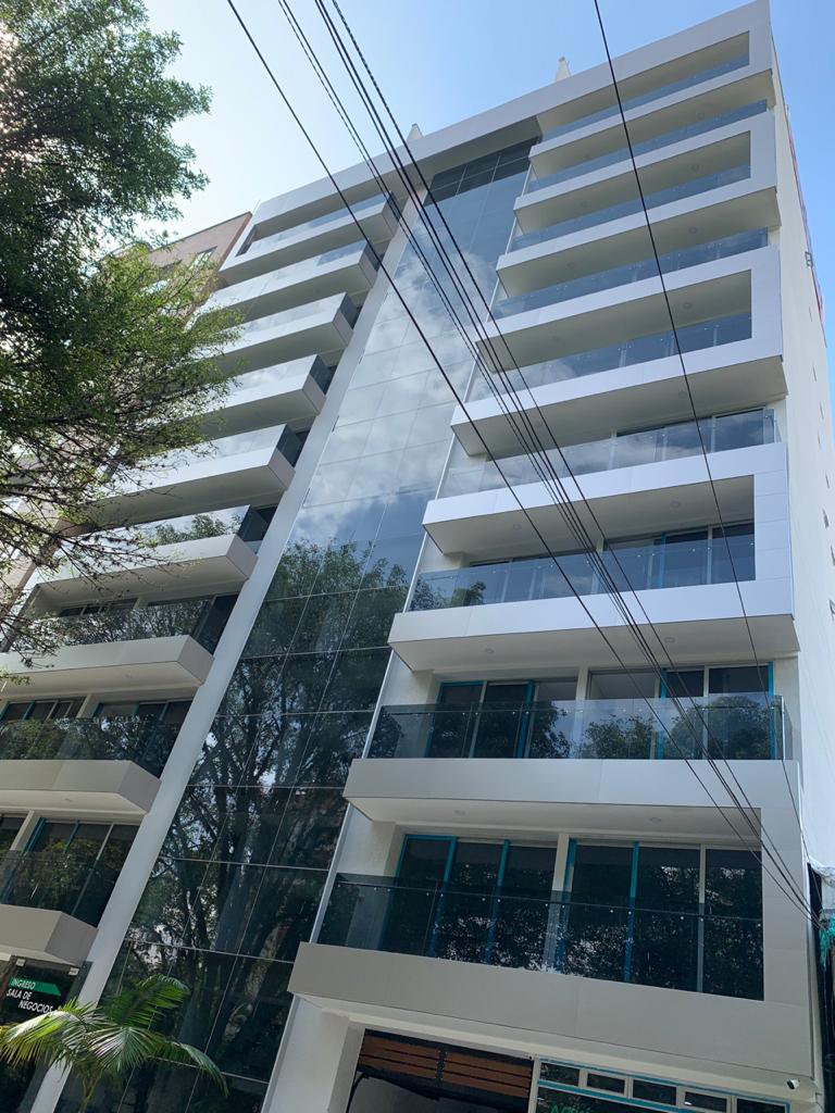 Fachada aluminio compuesto dark gray y sistema fachada piel de vidrio serie 45+ vidrio 6+5 DORADO